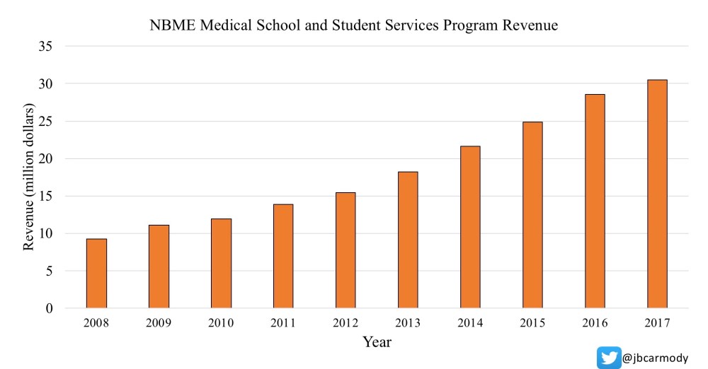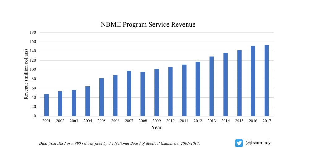 And no, this rise is not explained by inflation. This is real growth in real money taken in by the Board. Revenue derived from the NBME’s programs has more than tripled from 2001 ($47.5 million) to 2017 ($153.9 million).
