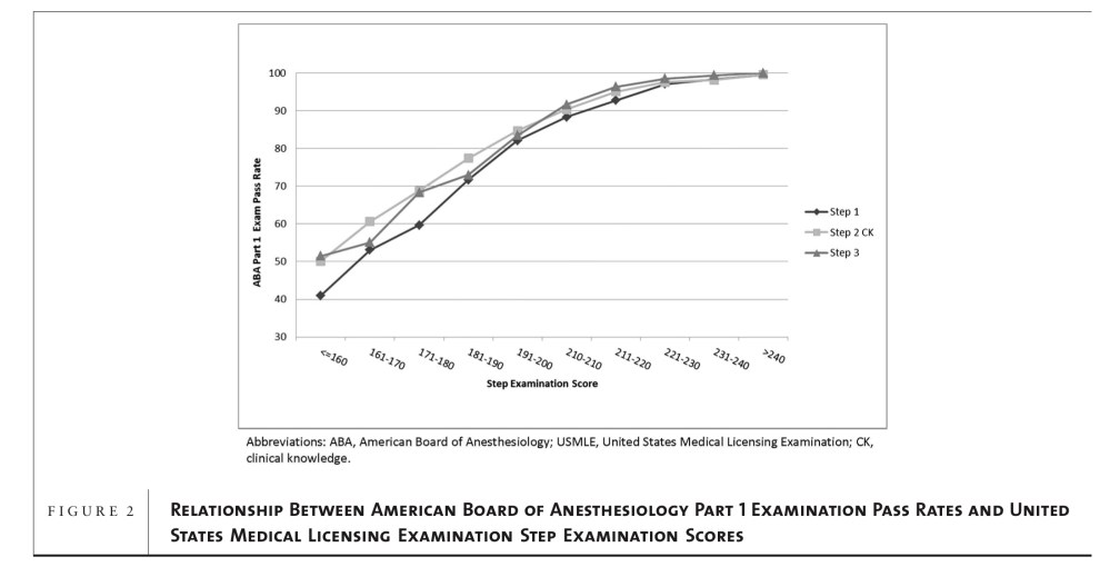 This one was also put together by the NBME. So it should not surprise you to learn that, after noting the correlation between USMLE and American Board of Anesthesiology (ABA) Part 1 scores, their conclusion was that this association “provides support for the validity of both testing programs.”