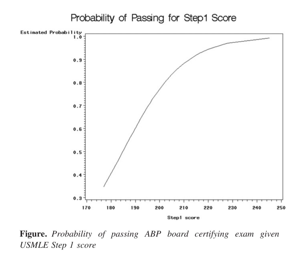 As the article’s title asserts, Step 1 scores did indeed predict board passage. The relationship is strong, as shown below: