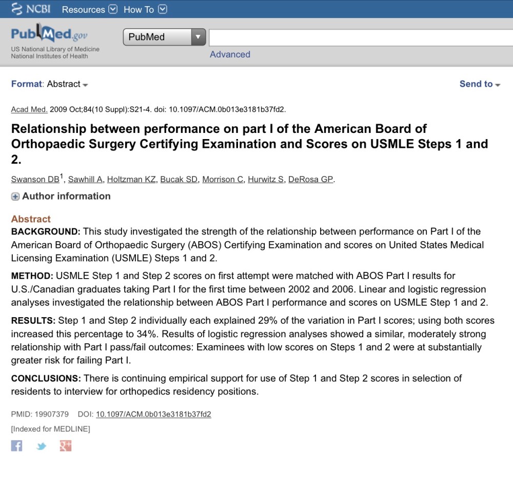 Swanson DB, Sawhill A, Holtzman KZ, Bucak SD, Morrison C, Hurwitz S, DeRosa GP. Relationship between performance on Part I of the American Board of Orthopaedic Surgery Certifying Examination and Scores on USMLE Steps 1 and 2. Acad Med 2009; 84(10 Suppl): S21-S24.