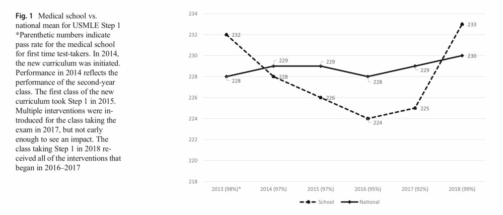 And this problem did not escape the notice of administrators. Soon, faculty were called upon to tool up and join the Step 1 arms race and get those scores back up. Over the following several years, the school made the following changes: