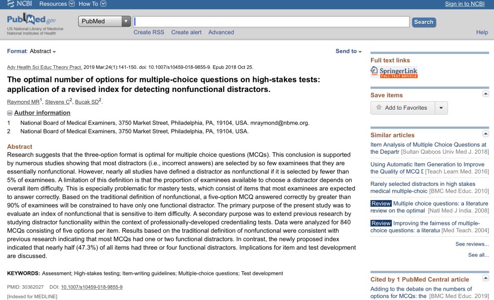 The paper is written by psychometricians with the goal of addressing something completely different: how many incorrect answer choices should be included with multiple choice questions? Their point is that, on an exam where most questions are answered correctly, an answer choice that is chosen by <5% of test-takers may still serve a useful role as a distractor. And I guess that’s a good point, as far as it goes.
