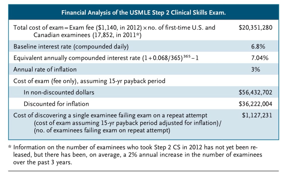 In 2013, a couple of residents made this very point in a stinging New England Medical Journal editorial. With some simple calculations, they showed that finding a single examinee who failed Step 2 CS twice cost $1.1 million.