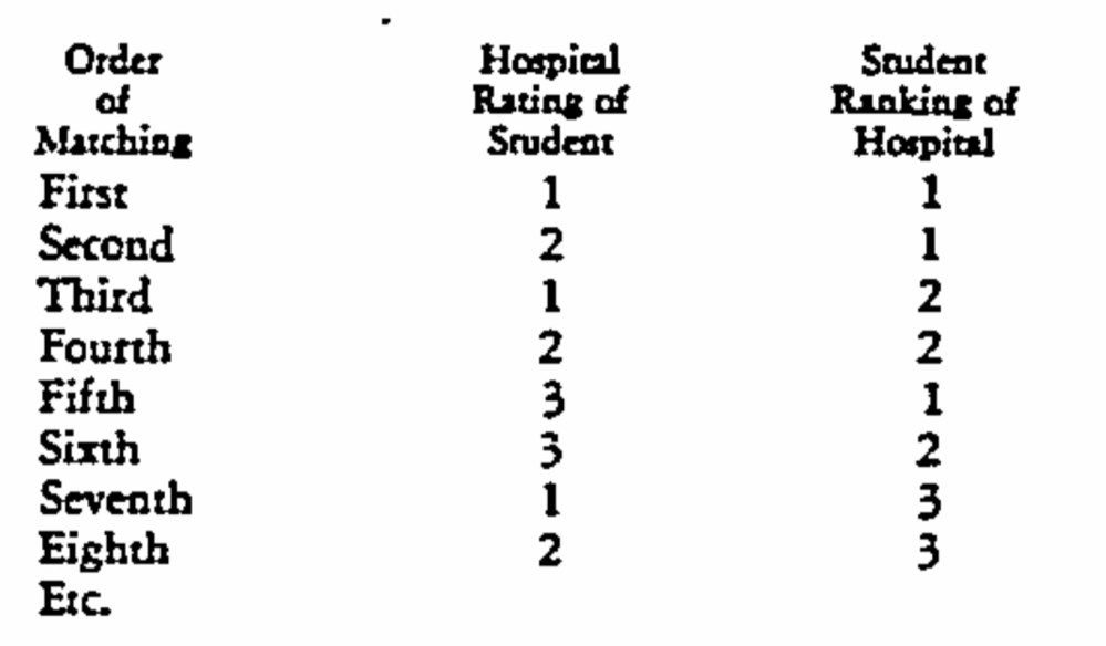 As shown above, the system would first Match up all pairs of hospitals and students who had each other ranked at the top of their list (so-called 1-1 matches). Then it would move on to match hospitals’ second choice with students’ first choice (2-1) matches, then to 1-2 pairings, 2-2, 3-1, 3-2, 1-3, 2-3, etc.