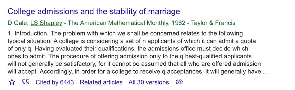 The seminal Gale-Shapley paper has been cited >6000 times and resulted in the 2012 Nobel Prize. (They didn’t know that a group of medical students had found a solution to the Stable Marriage problem a decade before.)