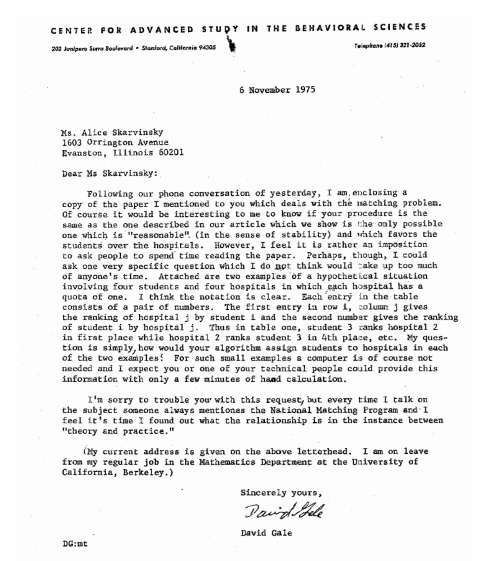Correspondence from mathematician David Gale to the NRMP, 1975.