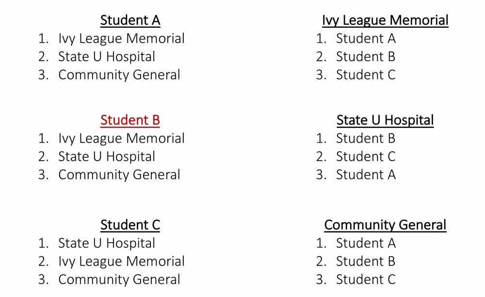To see why, imagine a situation in which there are three applicants (Students A, B, and C), and three hospitals of varying prestige/desirability (Ivy League Memorial, State U Hospital, and Community General). To keep things simple, let’s assume that each hospital can match only one student.