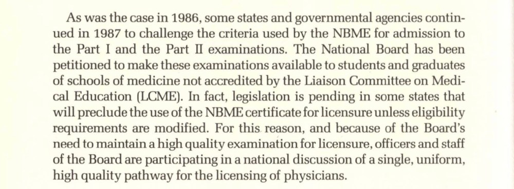 From the 1987 NBME Annual Report. The NBME’s exams could only be taken by U.S. medical graduates – and U.S. citizen IMGs successfully advocated for laws to write it out of existence unless that policy changed.