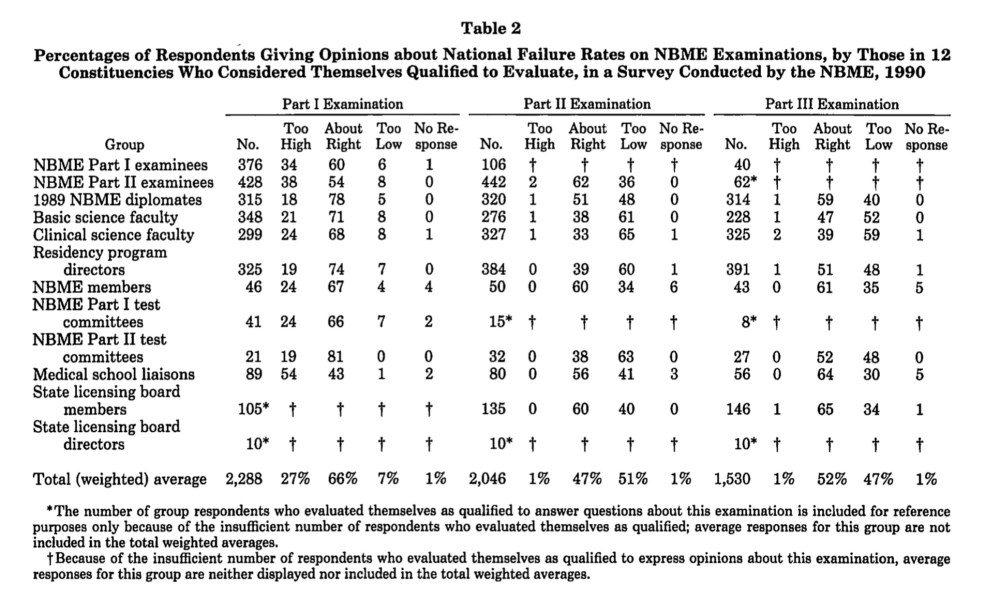 For instance, every few years, the USMLE asks a broad swath of stakeholders what they believe the ideal fail rate for its exams should be, and whether the current passing rate is “too high,” “too low”, or “about right.”