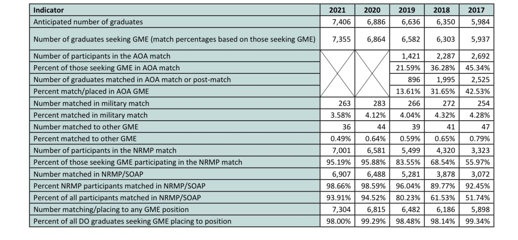 There really is no justifiable explanation for these discrepancies. These differences are not explained by the fact that some DOs match in the military or San Francisco Matches – those matches are long gone by the time of the NRMP Match, and successful applicants are required to to be withdrawn from the NRMP Match (it’s a Match violation for the school if they’re not).