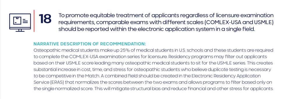 But if Recommendation #18 succeeds in establishing the COMLEX-USA as being equivalent to the USMLE for residency selection, the NBOME’s existence is all but assured – and they’ll find themselves in the enviable business position of selling exams to the rapidly-growing captive audience of osteopathic medical students for years to come. (You may therefore be unsurprised to learn that the NBOME’s CEO was a member of the specific UGRC workgroup that advanced this recommendation.)