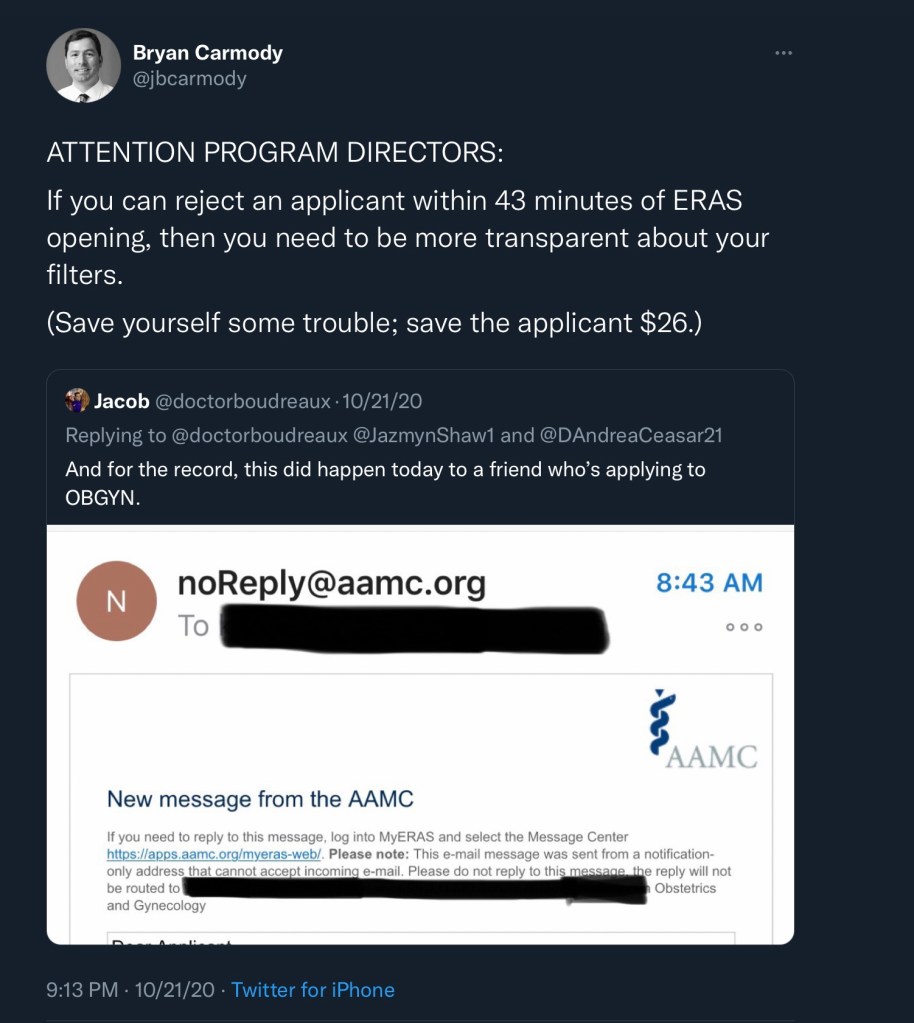 If this is implemented – and I have doubts it can be practically accomplished while maintaining the confidentiality of residents in the program – it would be a big victory for applicants, who may spend thousands of dollars applying to programs who never even read their application.
