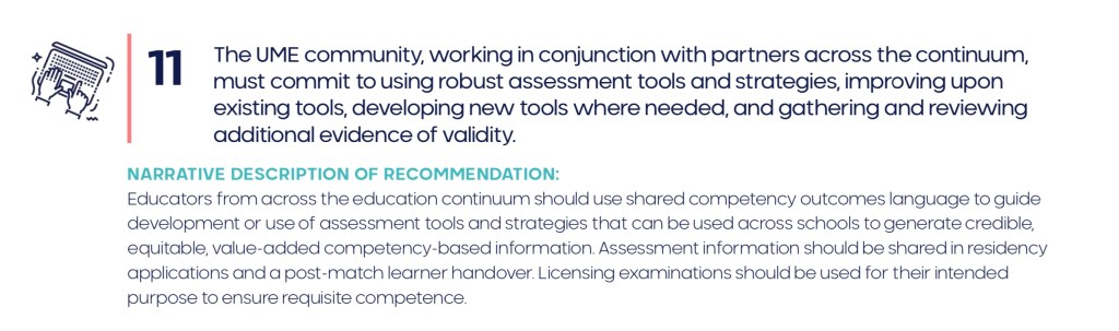 But Recommendation #30 calls for “meaningful assessment” after the Medical School Performance Evaluation (MSPE) is submitted in September, so that a individualized learning plan can be submitted to the student’s residency program prior to the start of residency.
