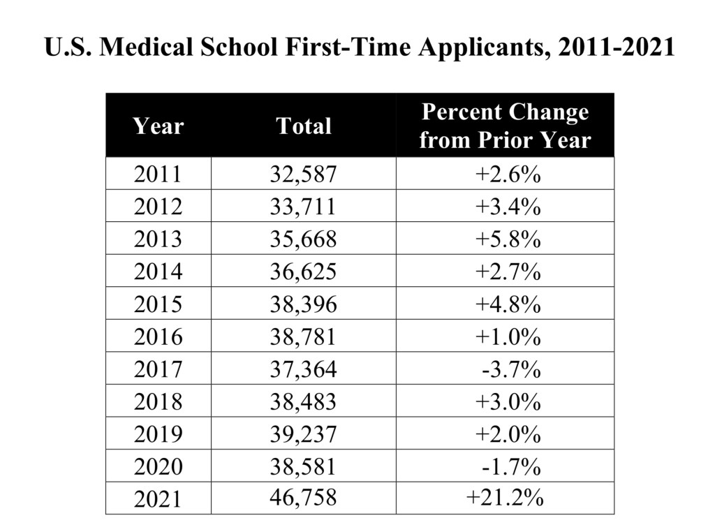 (It’s worth noting that the premise of the “Fauci effect” was implausible from the very beginning. To get into medical school these days requires years of planning and resume-padding. It strains credulity to believe that there was an enormous but untapped reservoir of qualified applicants who just so happened to have taken the MCAT and completed all academic pre-requisites, but just didn’t feel inspired to apply until they saw Dr. Fauci on the television. In reality, the surge in applications probably has more to do with ‘gap year’ opportunities drying up.)