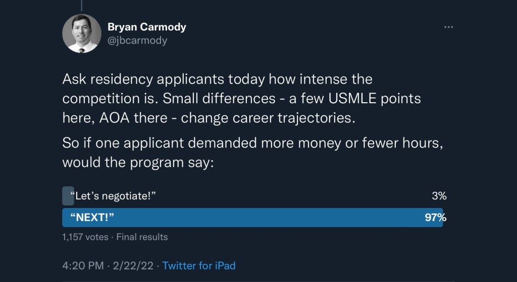 They often go on to point out – also correctly – that when Congress granted the NRMP a specific antitrust exemption, they robbed future residents the ability to play potential employers off each other, thereby negotiating for better pay or more humane hours. Do away with the Match, they say, and then residents will be able to negotiate for their true value.