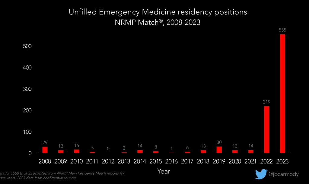 (Heck, while I’m at it, I’ll give you another bold prediction for next year: the “SOAP crisis” infecting EM will spread to pediatrics in 2024. The number of applicants to pediatric residency programs has been in decline, even as the number of programs expands – and many program directors aren’t yet paying attention. My guess is we’ll reach a tipping point next year and the number of unfilled pediatric positions will be >200. Just remember, you heard it here first.)