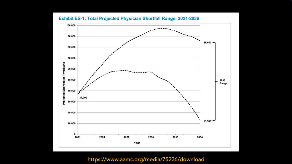 Credulous news outlets are quick to quote the AAMC’s upper bound estimate – that we’ll be short 86,000 doctors by 2036. But look at the slope on the equally-likely lower bound. Do you think the line will magically trend horizontally once it hits zero?