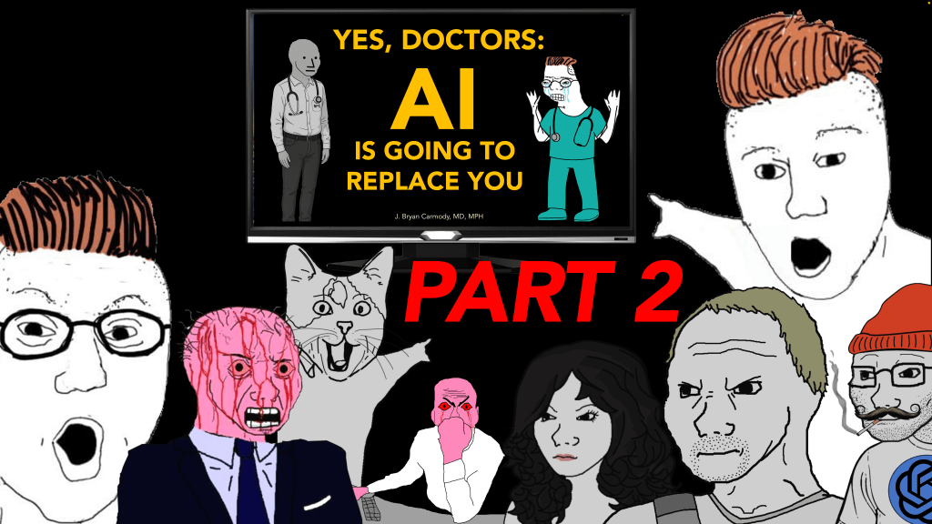 What I think really makes people so upset about this is not that I quoted Bill Gates or suggested that AI hallucination could be overcome – it’s the sense of hopelessness and inevitability that seriously analyzing this topic inspires. And for the record, I feel that, too. I’ve had numerous requests for a Part 3 focused on how physicians should counter AI replacement (from both an individual and a public policy point of view), and maybe I will – if only I can develop answers for myself.