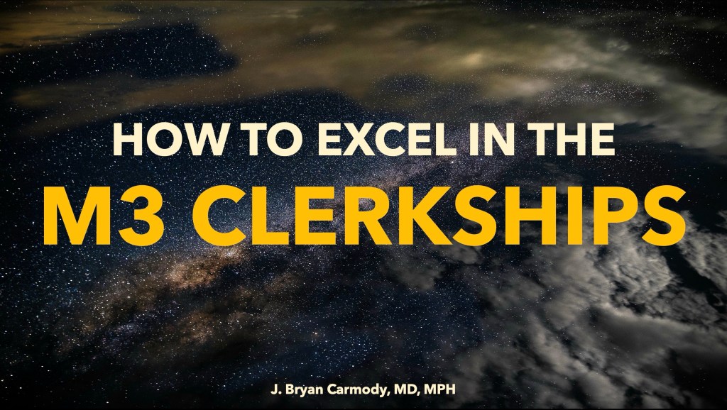 This is a version of a talk I got to give to a group of rising third-years on how to excel in the M3 clerkships. So if that sounds like something you might be interested in doing, I invite you to join me while share the highest-yield principles on how to think, how to learn, how to avoid common mistakes, and ultimately, how to stand out, earn strong evaluations, and thrive on the wards.